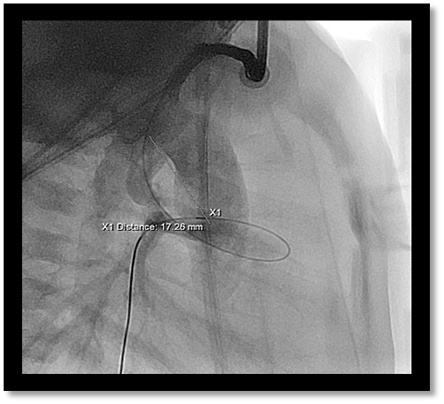 Figure 1: Lateral angiographic image demonstrating straight measurement of PDA from aortic to pulmonary artery end. Exact length can be difficult to discern especially in a tortuous as demonstrated here.