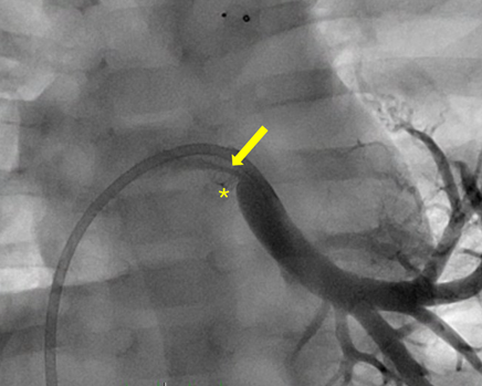 Figure 1. Frontal projection of a stented left lower pulmonary vein (*) with discrete distal stenosis (arrow) in an infant (5 mm x 8 mm Megatron DES).