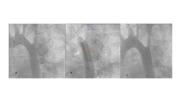 - Szabo technique: anchoring wire in the left subclavian artery (blue arrow), and covered stent (orange arrow) (Video 9)